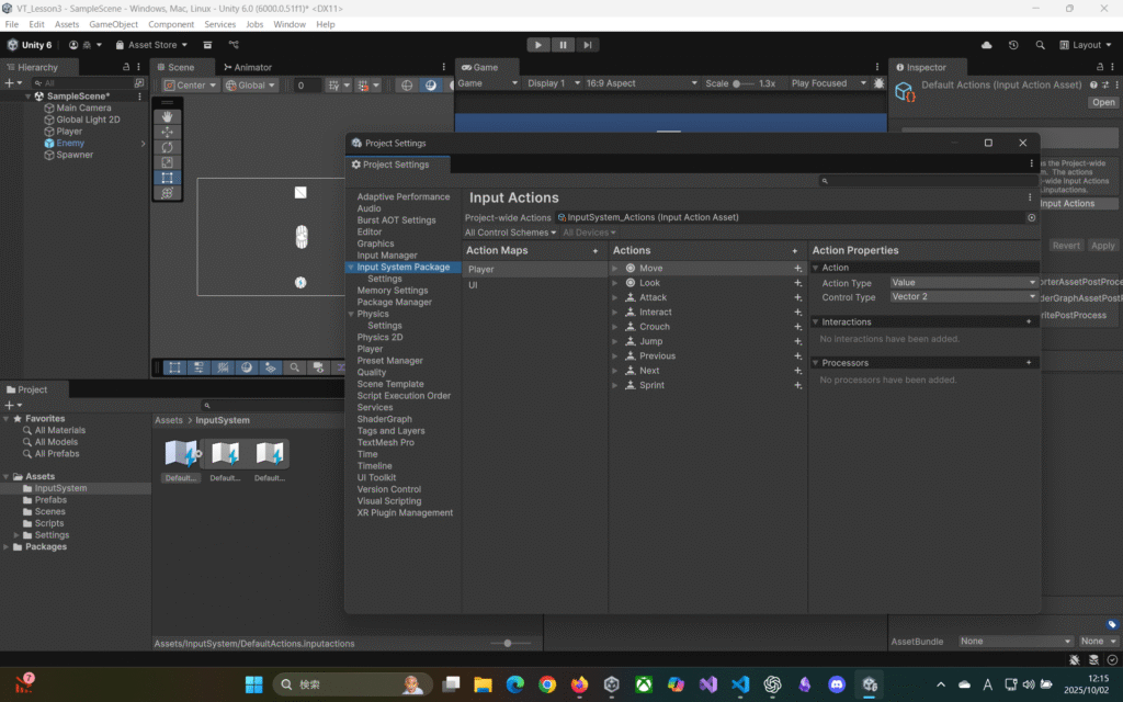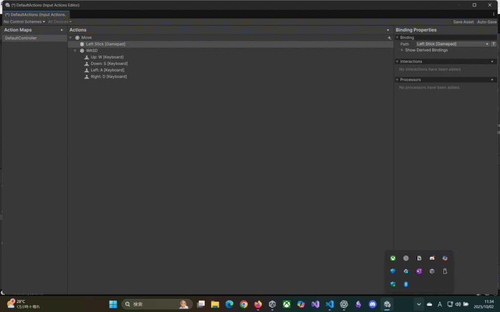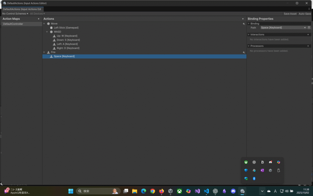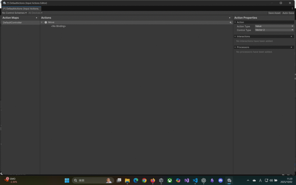 PlayerInput内のActionsにDefaultActionsをアタッチ。