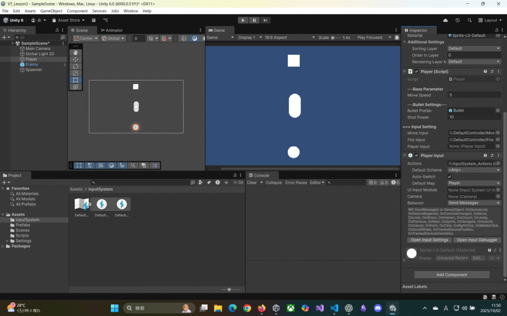 Playerオブジェクト内のInputSettingにコントローラーをアタッチ