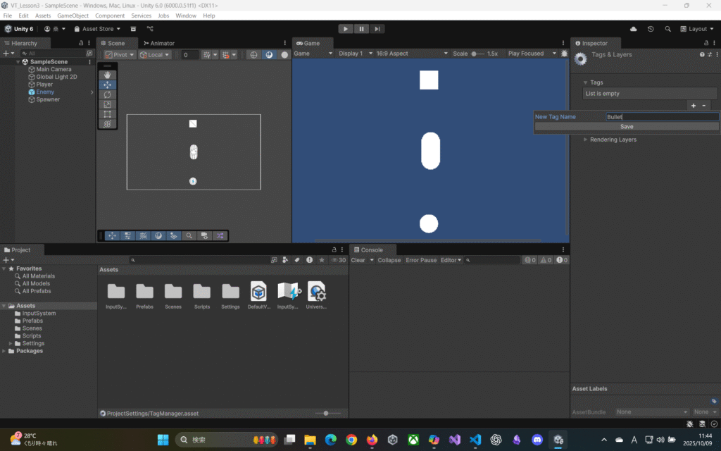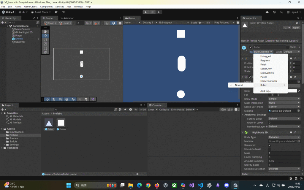 ⇒”Bullet”が含まれるタグを判別する。”EnemyBullet”にも引っかかる。