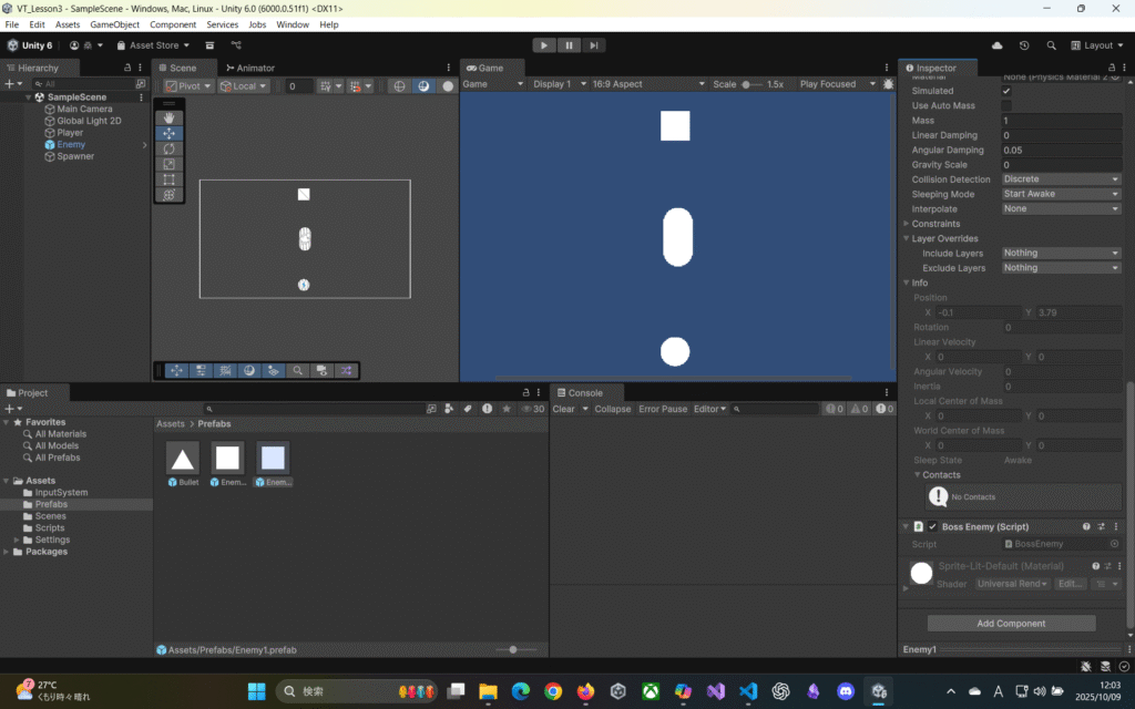 BossEnemy.csを作って、Enemy1にアタッチ。