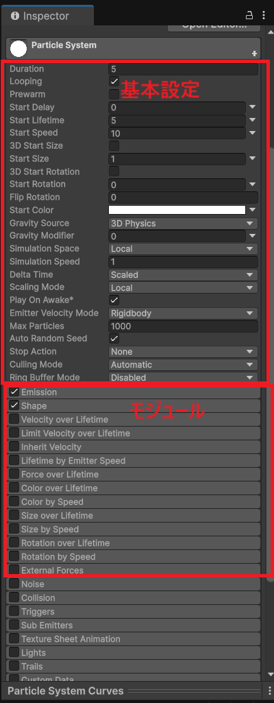 Unity6のParticle Systemでは、「火」「煙」「魔法」などの視覚効果を作るために、粒子(パーティクル)を細かく設定できます。基本設定は「Mainモジュール」で行います。