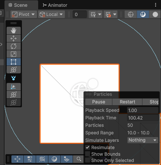 ParticleSystemコンポーネントがアタッチされたObjectを作成すると、シミュレーターがScene上に出現する。