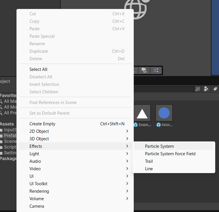 Hierarchy上で右クリック⇒Effects⇒ParticleSystem。